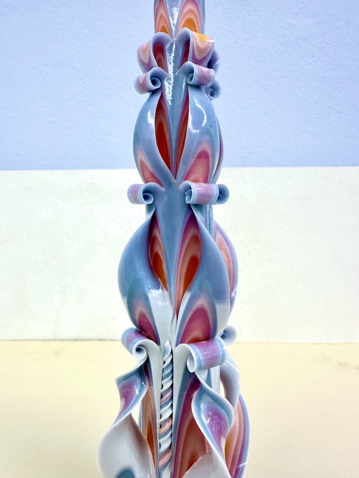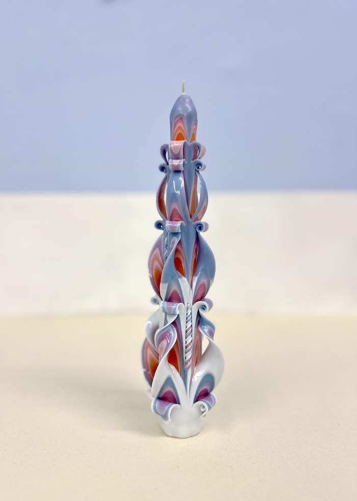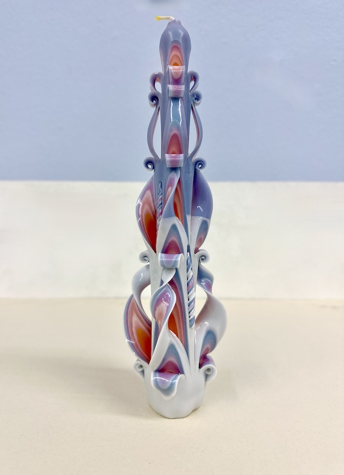 Candle carving is an old craft nowbody knows exactly where it came from. The whole process begins with a six-pointed candle base. The candles is dipped into various waxes in different colors, adding layers and layers of colored wax nearly 30 -35 times. Once the layers have been built up, the candle can be carved. Due to the fact that after 15 minutes the wax hardens the carver has to work quickly.
