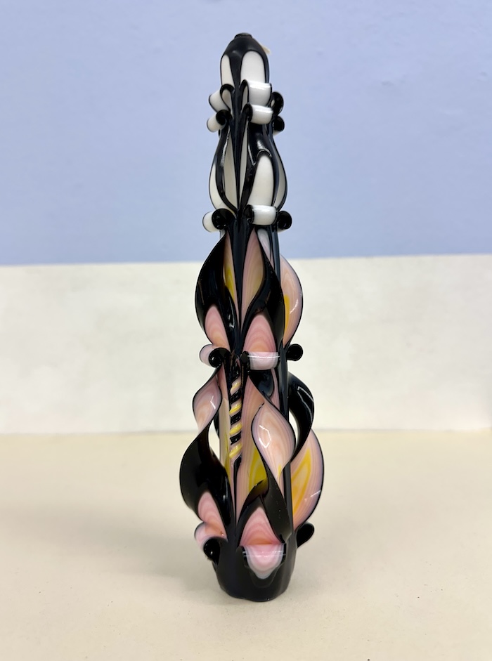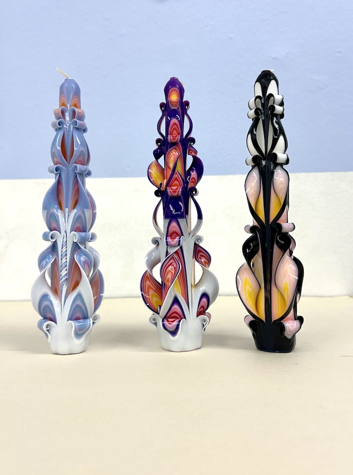 Candle carving is an old craft nowbody knows exactly where it came from. The whole process begins with a six-pointed candle base. The candles is dipped into various waxes in different colors, adding layers and layers of colored wax nearly 30 -35 times. Once the layers have been built up, the candle can be carved. Due to the fact that after 15 minutes the wax hardens the carver has to work quickly.