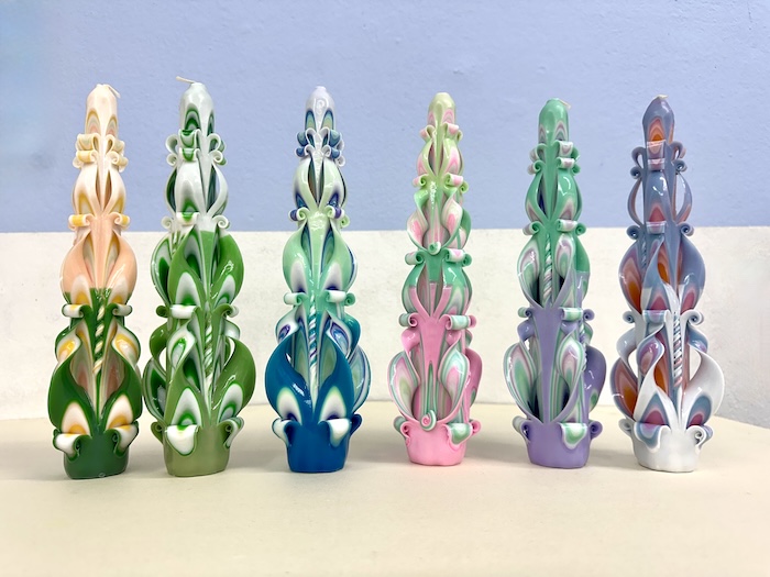 Candle carving is an old craft nowbody knows exactly where it came from. The whole process begins with a six-pointed candle base. The candles is dipped into various waxes in different colors, adding layers and layers of colored wax nearly 30 -35 times. Once the layers have been built up, the candle can be carved. Due to the fact that after 15 minutes the wax hardens the carver has to work quickly.