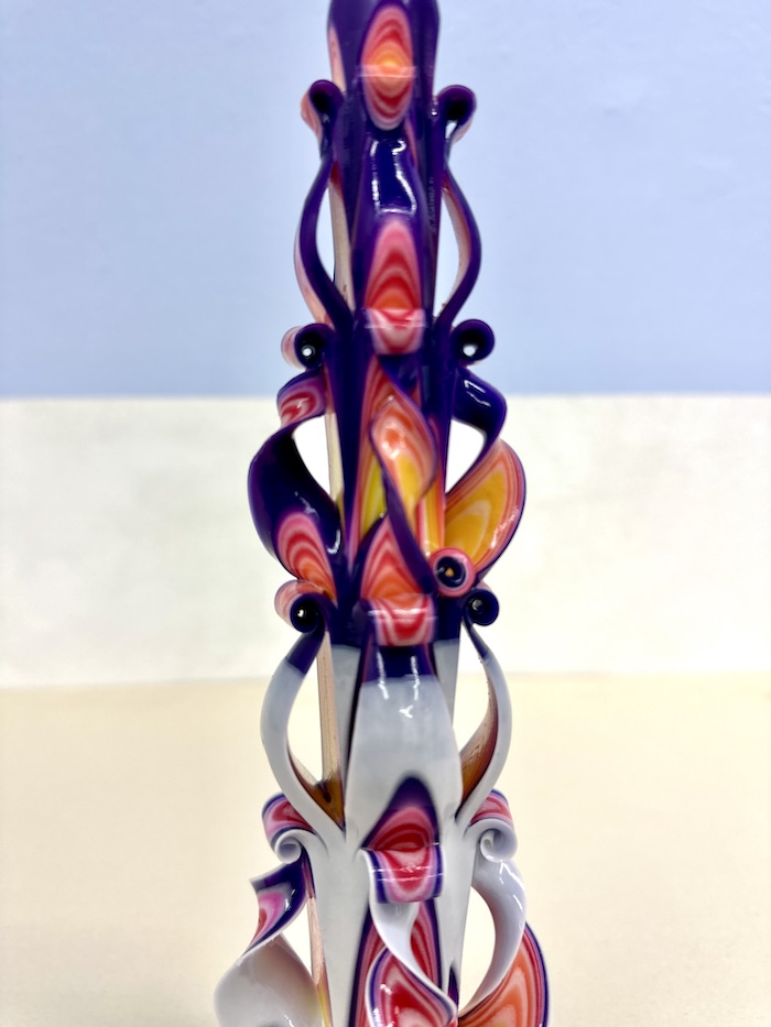 Candle carving is an old craft nowbody knows exactly where it came from. The whole process begins with a six-pointed candle base. The candles is dipped into various waxes in different colors, adding layers and layers of colored wax nearly 30 -35 times. Once the layers have been built up, the candle can be carved. Due to the fact that after 15 minutes the wax hardens the carver has to work quickly.