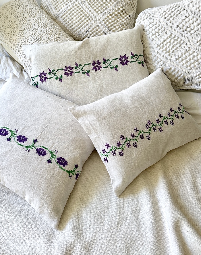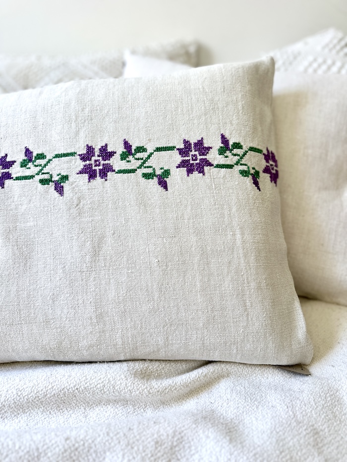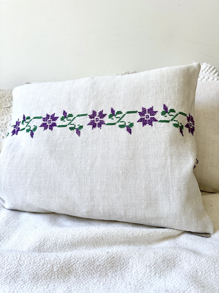 Cushion made with old linen textile from Hungary. 100 % handwoven linen, sophisticated embroidery by hand from the late 3rd quarter of 20th Century. The unique material was formerly used as towel.