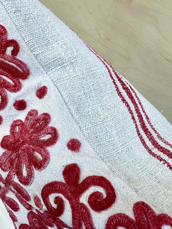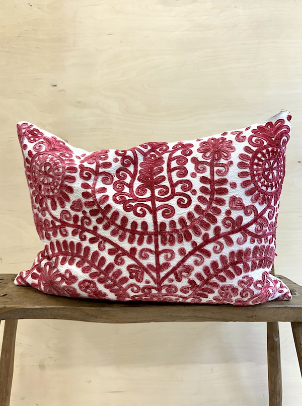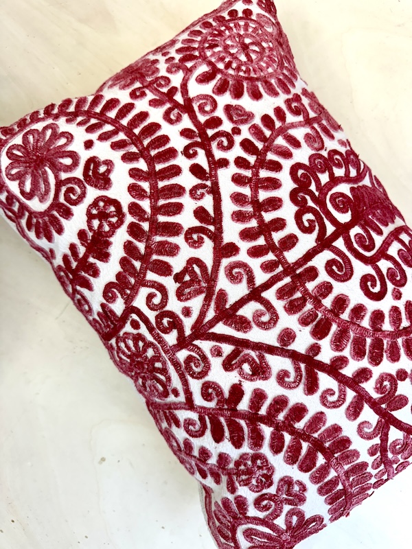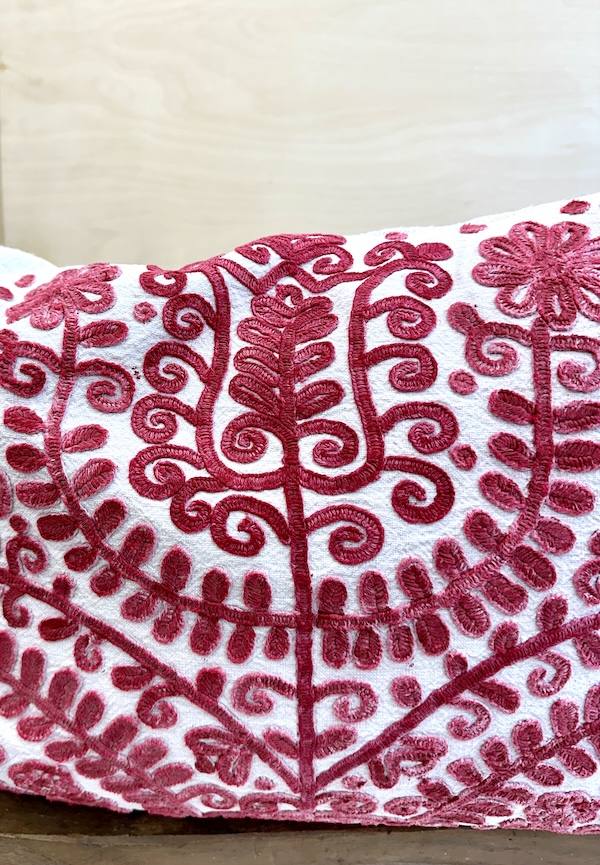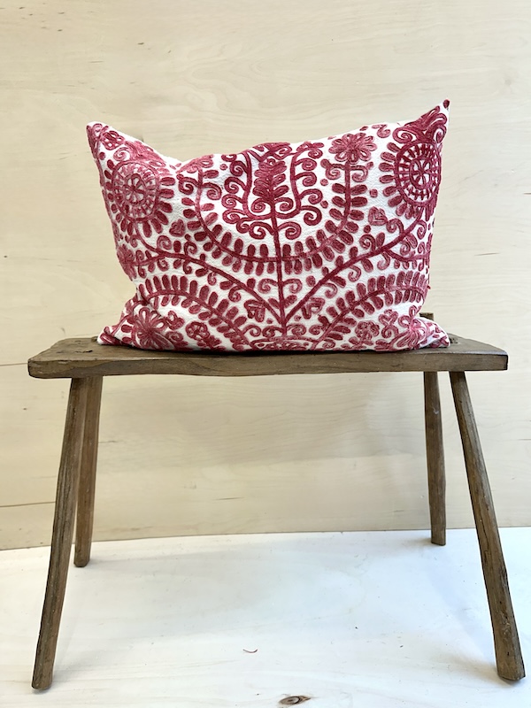 Hand stiched pillow from the northwestern region of Transsilvania, Kalotaszeg. The region is famous for their beautifully enriched art. One of the most famous composer of our time is Belá Bartók whose collection can be admired at the ethnological museum in Budapest. The stichings from Kalotaszeg are monochrom, usually in red, white and blue. In particular the densely stiched ornamental floral designs in geometrical order and the love for geomatrical designs demonstrate the strong influence of Rumanian art. The lovely ladies of Kalotaszeg, who still master the art of stiching at their homes also like the more playful motives of Hungarian designs. However the motives are drawn first and then stiched on the handwoven linen.