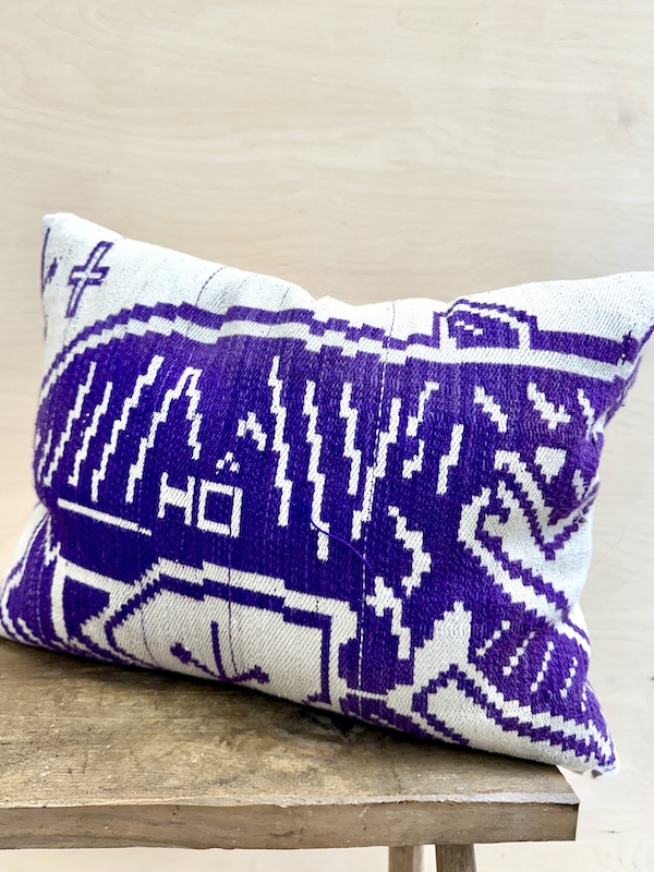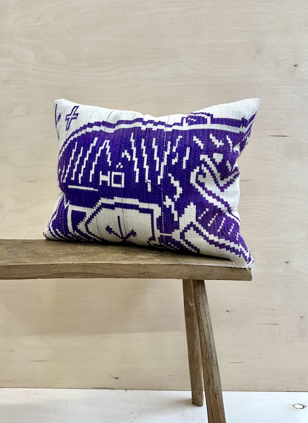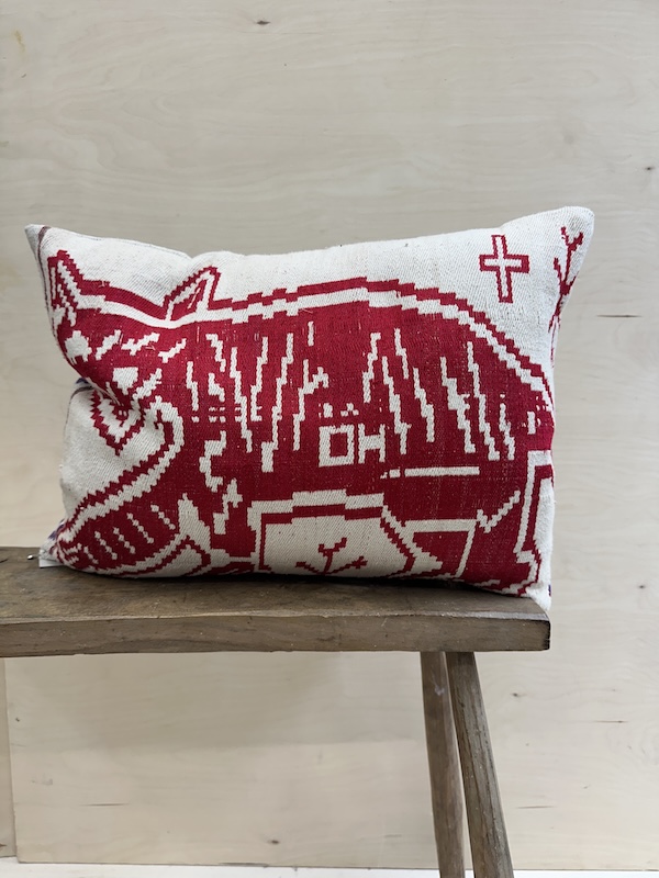 The textile od this cushion was part of an festivity banner, in lao tung kon dtaai.These banners were often used for funerals. They hung from poles in front of the deceases house and in the cementery near the burial size. Often these banners are decoreted with animals such as birds, elephants and deers. In general the funeral helps leaving the earth and finding heaven. Together with the shaman’s spirit the animals guide the dead on the air road to heaven.
