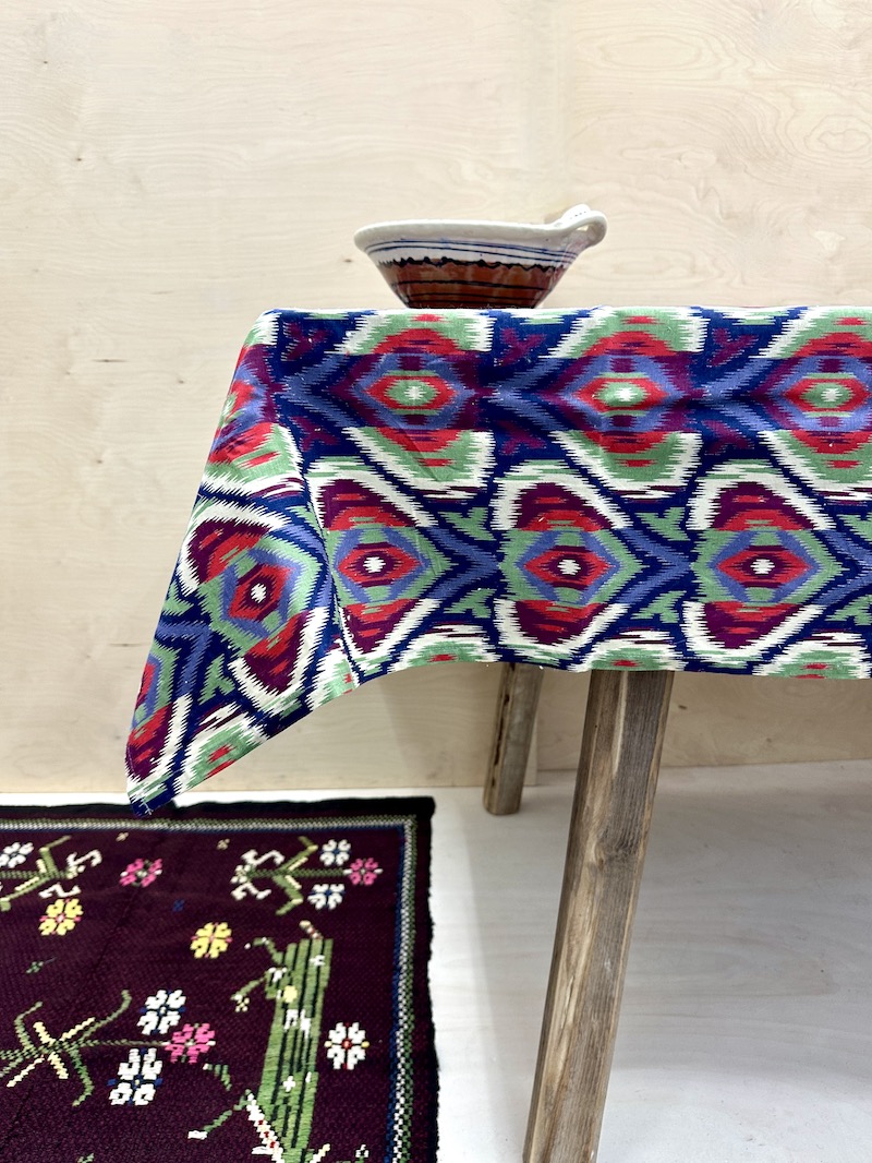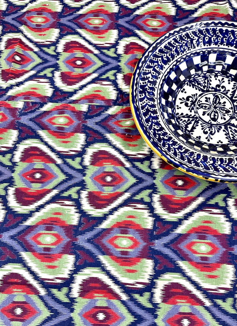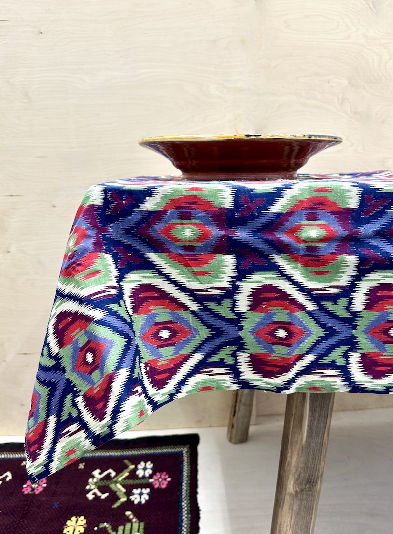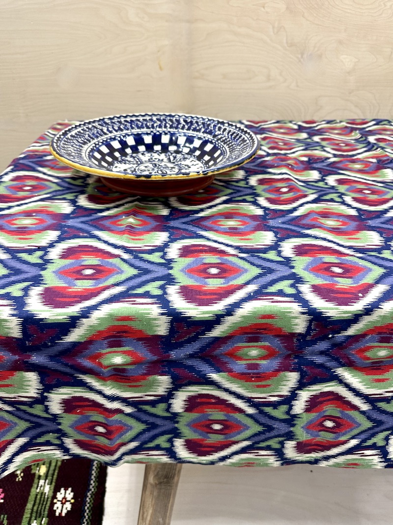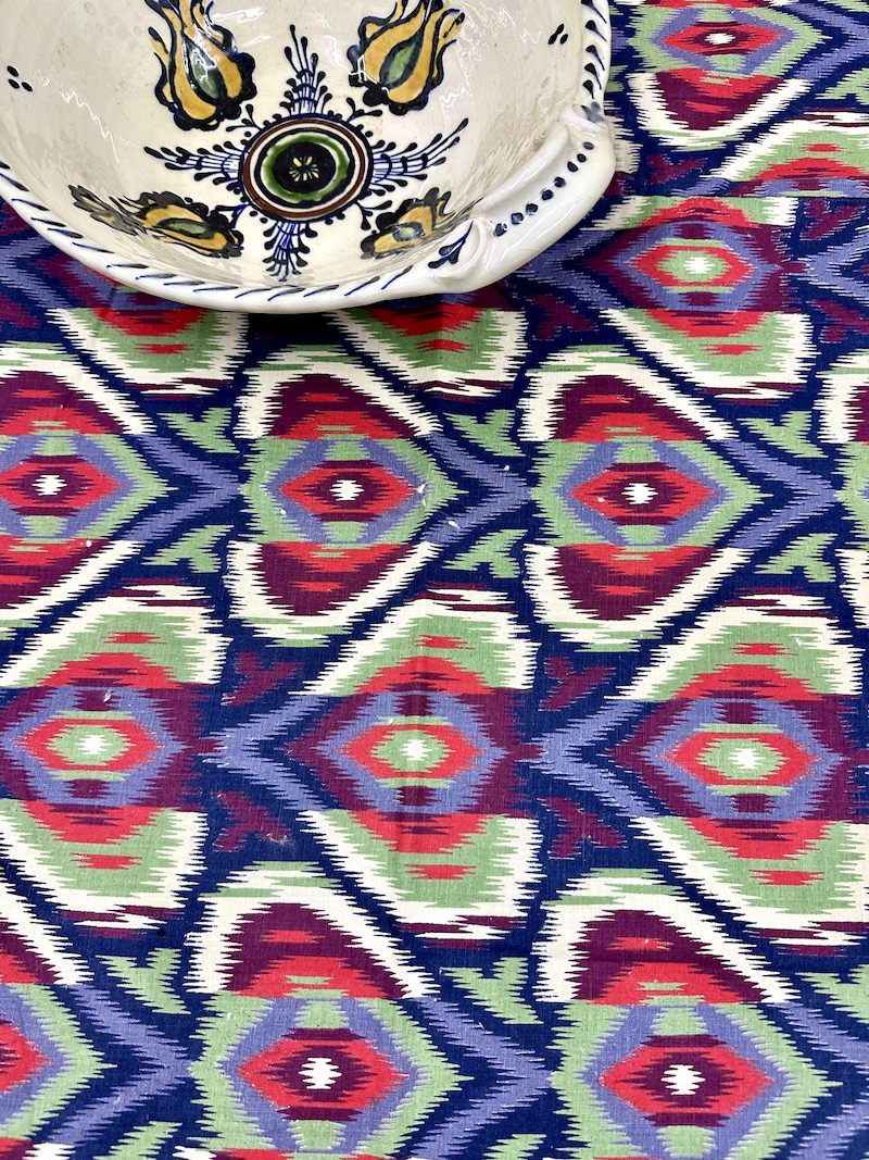 In addition to hand-made textiles, printed fabrics also play an important role in Uzbekistan. During the “Great Game”, the economic and strategic race between colonial powers for supremacy in Central Asia, the British Empire tried to gain a foothold in the Central Asian market by exporting printed fabrics, which were very popular due to superior quality and competitive prices. When Russia won the race for Central Asia, English textiles were largely replaced by industrial goods from Russia. These colourful, predominantly psychedelic-looking prints also managed to displace woodblock prints, which had been used on many textiles until the end of the 19th century. Central Asia became an important outlet for Russian textiles. With their chintz and printed textiles, the Russians managed to carve out a niche for themselves between expensive domestic silks and velvets, and the much cheaper adras fabrics and block prints. Russian roller-printed fabrics were used all the time and everywhere. For lining chapans and making dresses, blankets or even mattresses, Russian floral prints or uzbek faux ikat designs were as much a part of Central Asia as sun and tea.